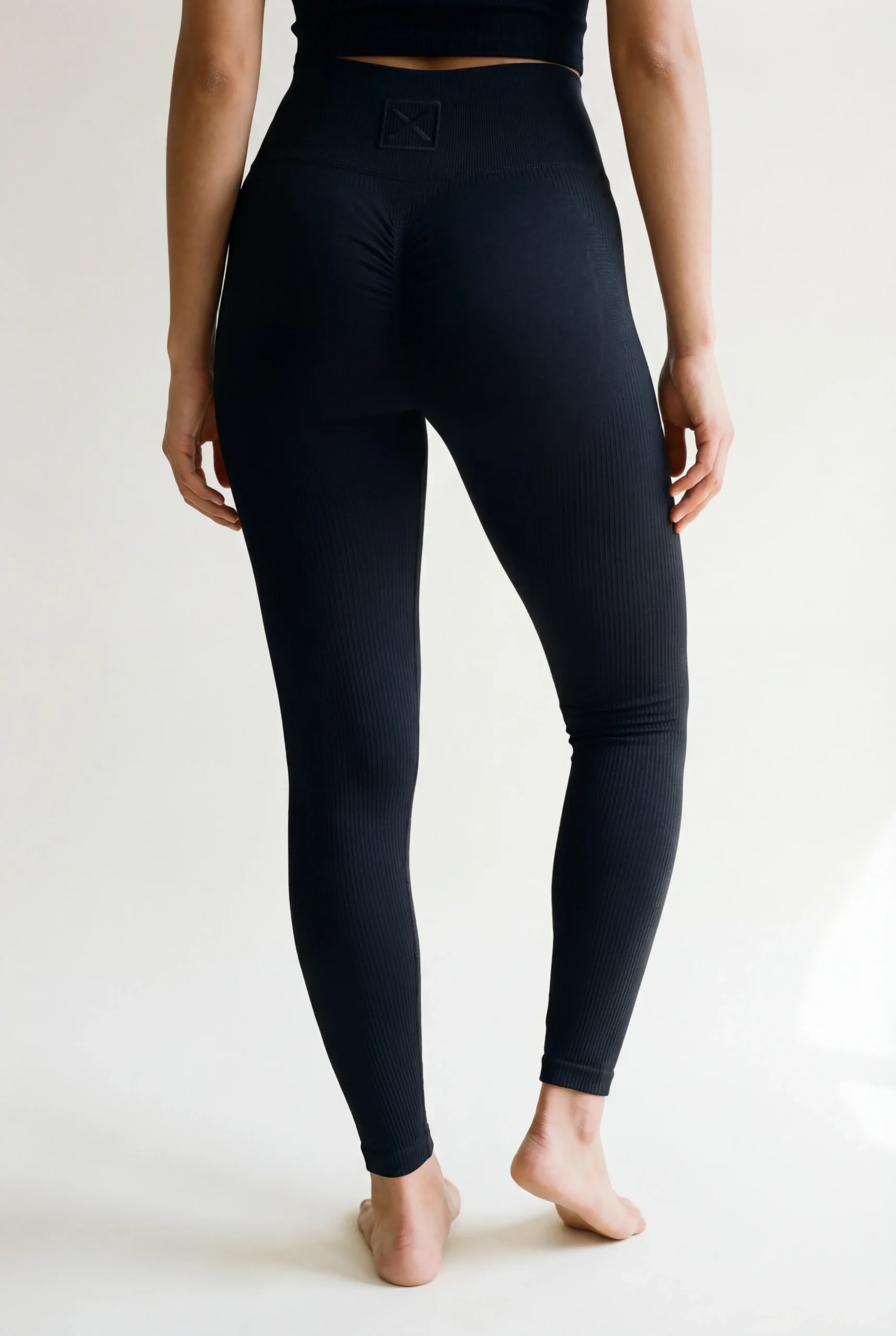 Leggings: Tiro alto con pretina ancha de compresión, diseño de contorno sombreado en muslos y costura posterior con efecto push-up (scrunch) para realzar los glúteos.